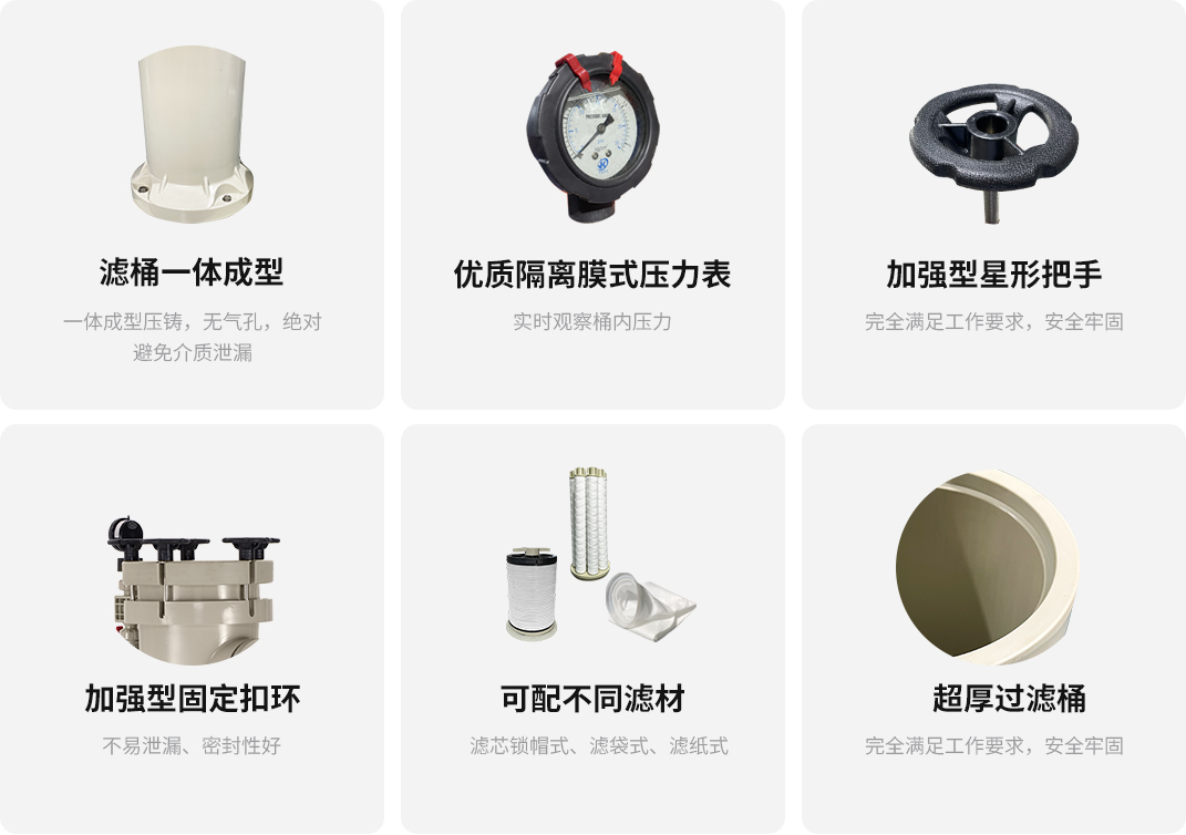 耐腐蝕能性及結(jié)構(gòu)強(qiáng)度加厚桶一體成型設(shè)計(jì),配套多種款式濾材,整機(jī)無焊接點(diǎn),無泄漏